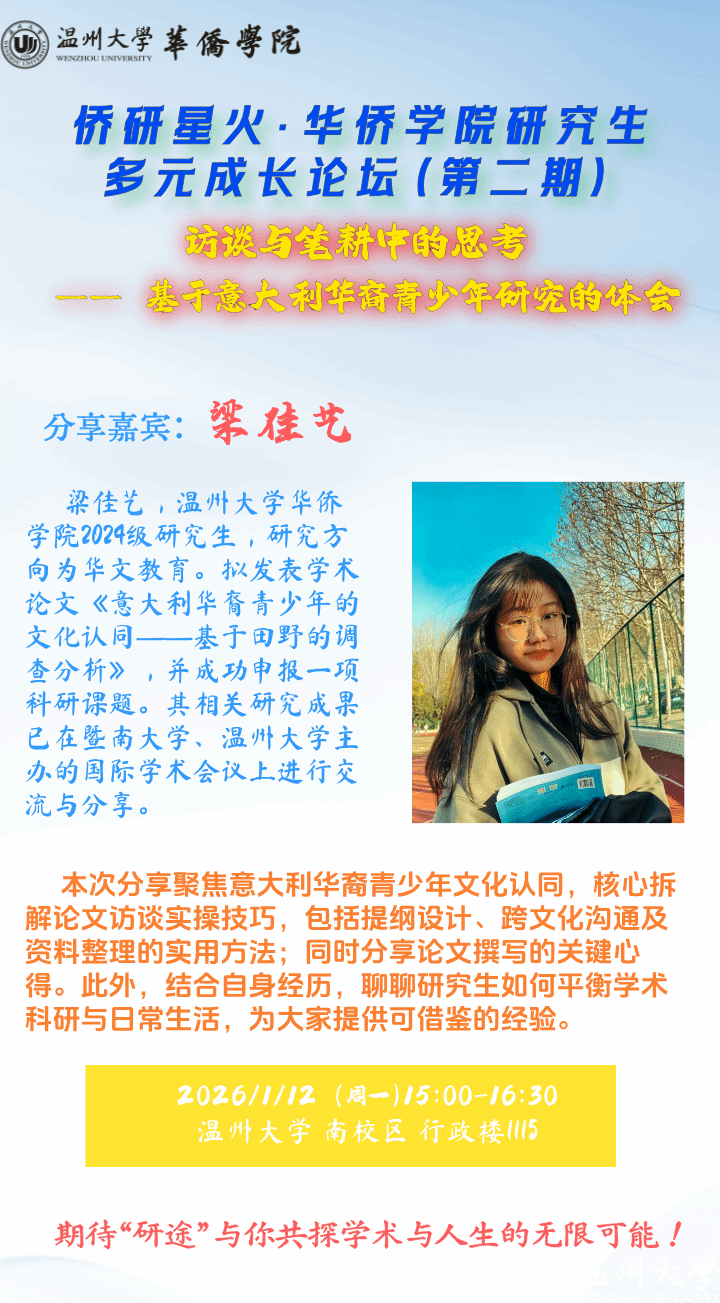 本次分享聚焦意大利华裔青少年文化认同,核心拆解论文访谈实操技巧,包括提纲设计、跨文化沟通及资料整理的实用方法;同时分享论文撰写的关键心得。此外,结合自身经历,聊聊研究生如何平衡学术科研与日常生活,为大家提供可借鉴的经验。