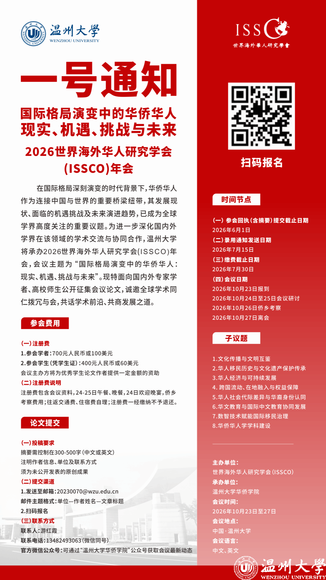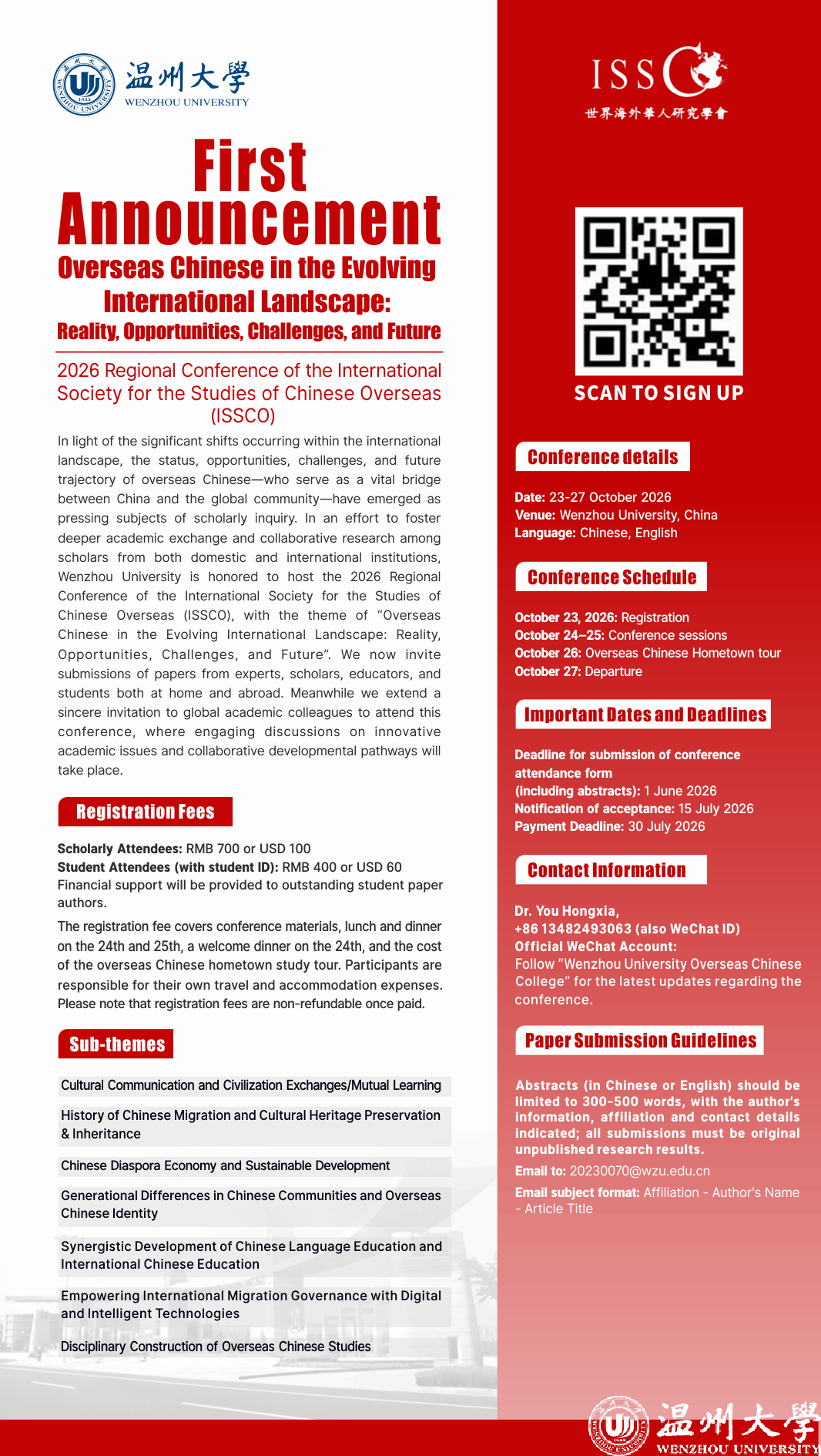 In light of the significant shifts occurring within the international landscape, the status, opportunities, challenges, and future trajectory of overseas Chinese--who serve as a vital bridge between China and the global community--have emerged as pressing subjects of scholarly inquiry. In an effort to foster deeper academic exchange and collaborative research among scholars from both domestic and international institutions,Wenzhou University is honored to host the 2026 Regional Conference of the International Society for the Studies of Chinese Overseas (ISSCO), with the theme of "Overseas Chinese in the Evolving International Landscape: Reality, Opportunities, Challenges, and Future". We now invite submissions of papers from experts, scholars, educators, and students both at home and abroad. Meanwhile we extend a sincere invitation to global academic colleagues to attend this conference, where engaging discussions on innovative academic issues and collaborative developmental pathways will take place.